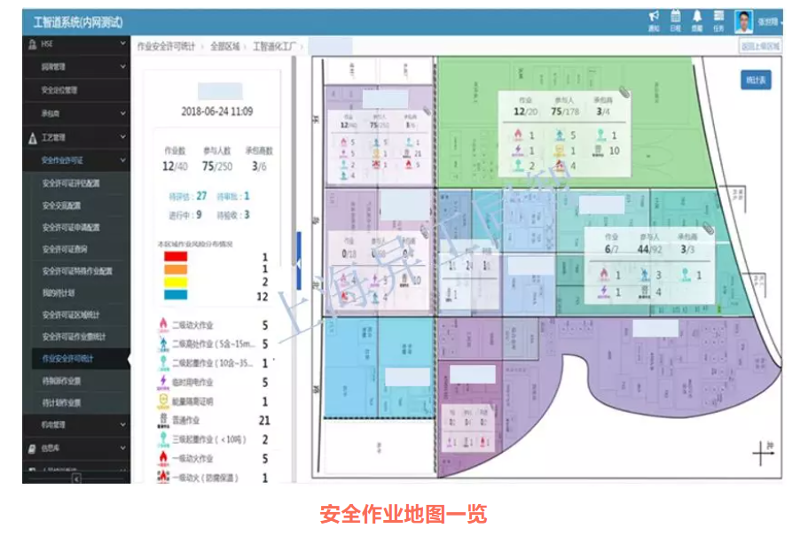 安全作業地圖概覽全廠作業情況,各種統計數據一目了然,實現可視化管控。